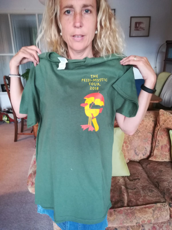 The 2018 shirt was designed in expectation of a wet summer. Those expectations weren't met. Here's Kate modelling the shirt before the tour.