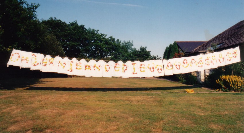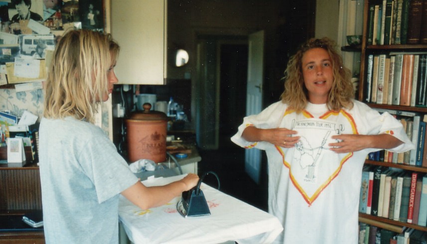The 1996 tour was Ernie and Jo's honeymoon. Annie did the drawing of the two of them holding hands on top of a wicket. She, Kate and Donna painted on the hearts and then they had to iron every shirt to set the fabric paint. The same three did the yellow-and-orange footprints on the back. When you got the right people together in the right order, you could spell out the words ERNIE AND EDIE.